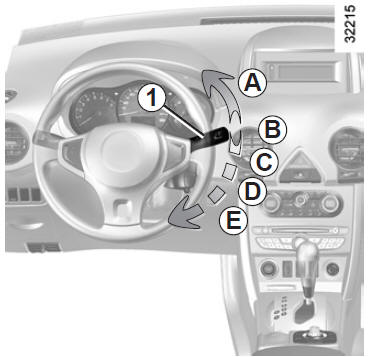 action sur le pare-brise (lavage du véhicule, dégivrage, nettoyage du pare-brise...) ramenez la manette 1 en position B (arrêt). Risque de blessures et/ou de détériorations. |