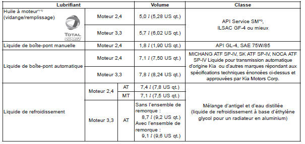 Kia Sorento: Lubrifiants recommandés et volumePour aider à maintenir la performance et la durabilité du moteur et du groupe motopropulseur, n'utilisez que des lubrifiants de bonne qualité. Utiliser les bons lubrifiants aidera le moteur à tourner rondement et favorisera une bonne consommation de carburant.
