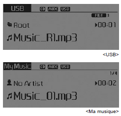 Mode CD audio, CD MP3, USB, iPod, Ma musique : RPT à l'écran.
