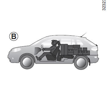 Placez toujours les objets transportés de façon à ce que leur plus grande dimension soit en appui contre le dossier de la banquette arrière, ce qui est le cas pour les chargements usuels (exemple A) ou contre les dossiers des sièges avant lorsque les dossiers de la banquette arrière sont rabattus (exemple B).